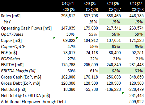 The same pattern holds for Google, Meta, and Amazon. Our framework suggests room for 2.2x, 2.3x, and 1.8x increases respectively. Underlying AI-related capex would grow faster still as other categories are deprioritized. And these numbers rise meaningfully if debt enters the picture: levering each company to just 1x net debt-to-EBITDA would unlock roughly $1.5tr of additional firepower, on top of $1.7tr they can self-fund over three years. At that point, 40–50% annual capex growth becomes achievable.