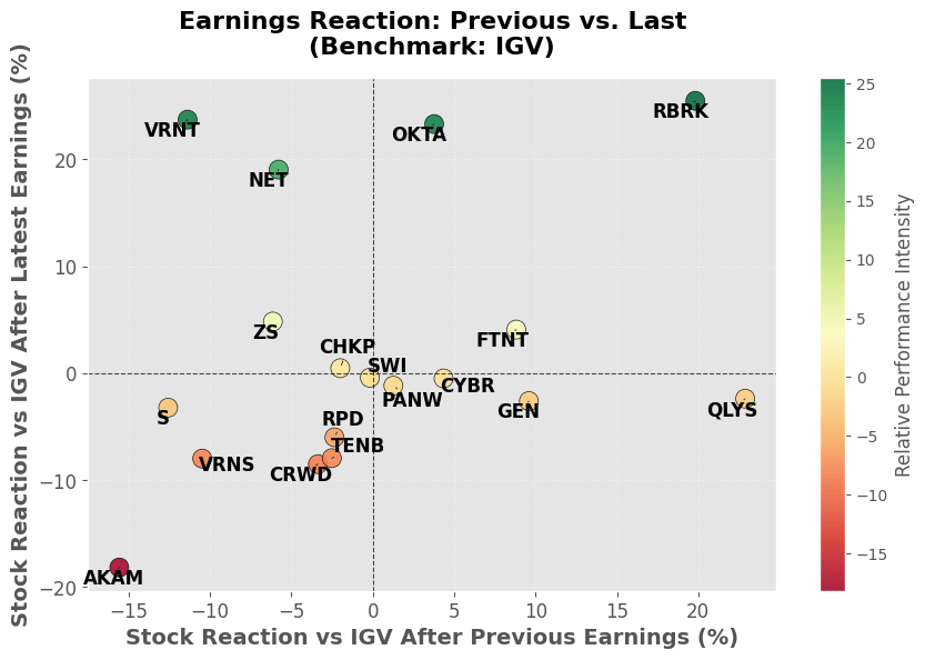 The focus on identity, access, and privilege management caught investors off guard. Chart 2 tracks post-earnings stock performance relative to the iShares Expanded Tech-Software ETF (IGV), which benchmarks North American software stocks, led by Oracle, Salesforce, and Microsoft. Okta and Rubrik saw strong reactions, while vulnerability management vendors (TENB, RPD, QLYS) underperformed, suggesting weak growth wasn’t fully priced in.